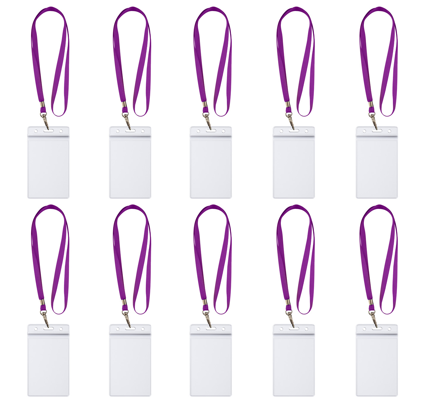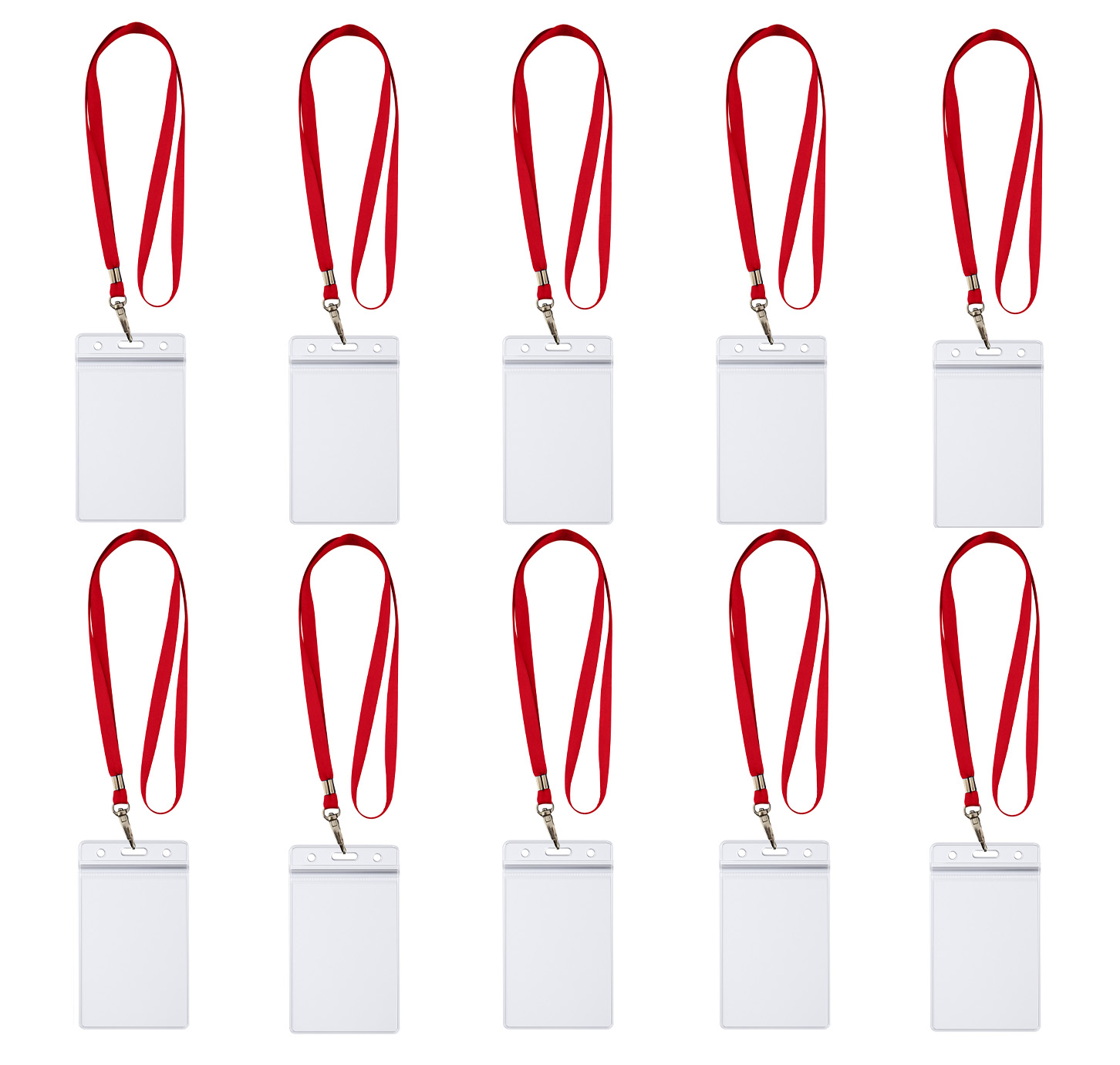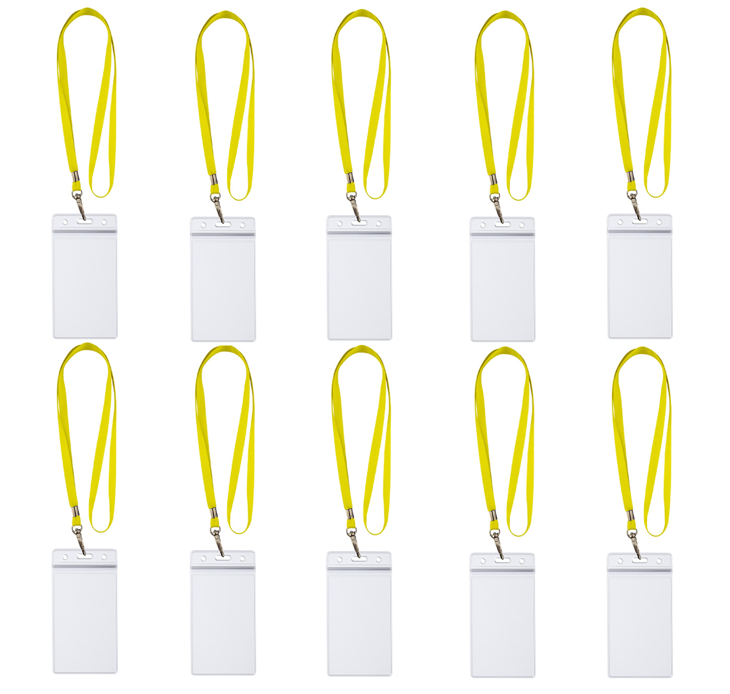 Das Set enthält 10 Ausweishüllen (horizontal und vertikal) sowie 10 Umhängebänder (Lanyards) zur direkten Nutzung.